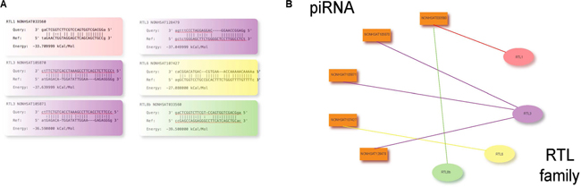 Figure 4: (A) miRanda target prediction reveals the potential for direct binding interactions between specific piRNAs and RTL family genes. (B) Conceptual map of miRanda-predicted piRNA-RTL binding interactions.