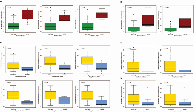 Figure 5: (A–B) Boxplots correlating expression of select HPV-dysregulated piRNAs to (A) PTEN mutation and (B) NOTCH mutation. (C–D) Boxplots correlating expression of select HPV-dysregulated piRNAs, (C) NONHSAT069719, (D) NONHSAT108298, and (E) NONHSAT123636, to common copy number variations in HNSCC (Wilcoxon rank sum, p < 0.05).