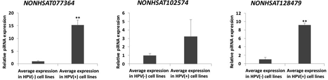 Figure 7: qRT-PCR verifies dysregulation of NONHSAT077364, NONHSAT102574, and NONHSAT128479 in HPV(+) cancer vs. HPV(–) normal cell lines. (Student’s t-test; **p < 0.01).