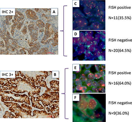 Figure 1: Relationship between c-MET protein expression and MET gene copy number in lung adenocarcinoma by IHC and FISH. (A and B) show IHC with moderate (IHC2+) and strong (IHC3+) staining,respectively. (C–F) show FISH positive and negative specimens that have been divided into two groups based on IHC analysis.