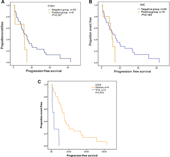 Figure 2: Progression-free survival (PFS) curves for the 58 patients treated with Gefitinib or Elorinib. (A) PFS curve by c-MET copy number measured by FISH. (B) PFS by c-MET protein expression measured by IHC. (C) PFS by EGFR mutation status.