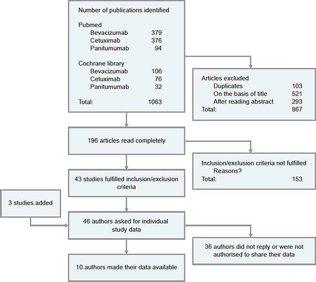 Overall, 1063 potential publications were identified on the PubMed and Cochrane databases; of these, 867 were excluded based on reading the title, the abstract or being duplicates, leaving 196 articles to be read completely. Of these 196 articles, 43 fulfilled the inclusion and exclusion criteria and 3 further studies were identified; hence, 46 authors and three pharmaceutical companies were contacted for individual study data. In total, we received primary data from 10 studies [13–22] with different chemotherapeutic agents or regimens, all of them were from cooperative groups only. The chemotherapy backbone included infusional 5FU or capecitabine based combination regimens with either oxaliplatin or irinotecan ± bevacizumab (Table 1; Figure 1). From 8 trials complete datasets were analysed [14–21]. From two studies, safety data were not available for analysis [13, 22]. All studies included had been approved by ethical committees.