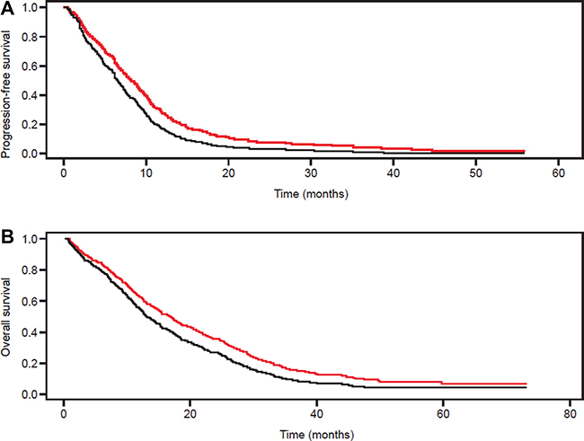 Figure 2: (A) Progression-free survival and (B) overall survival in patients ≥ 70 years of age with mCRC treated with standard chemotherapy with (red lines) or without (black lines) bevacizumab in the single study populations. Displayed is the summary estimation from a Cox regression with frailty approach. The median PFS was 8.2 vs. 6.5 months and the median OS was 16.7 vs. 13.0 months in patients treated with and without bevacizumab, respectively.