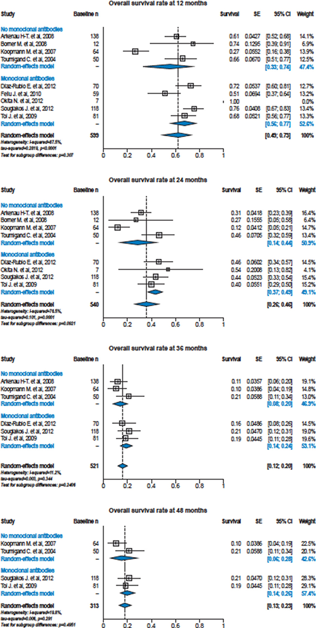 The incidences of potential toxicity markers included in the dataset were evaluated for treatment arms with and without monoclonal antibodies. These incidences were summarised by calculating overall proportions using a DerSimonian and Laird random effect model on logit scale. A two-sided Q-test was used to compare incidences in patients treated with and without monoclonal antibodies and this analysis was illustrated using Forest plots.