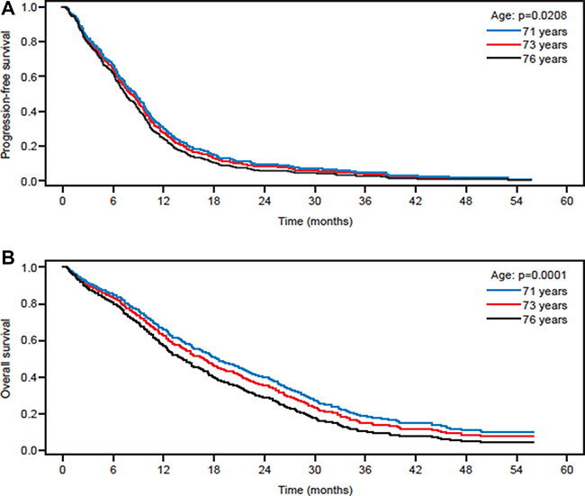 Figure 5: Effect of age in all patients on: (A) progression-free and (B) overall survival based on a Cox regression curve with age as quantitative covariate in patients ≥70 years of age with mCRC. The exemplary values of predicted survival curves at 71, 73 and 76 years of age correspond to the first quartile, median age and third quartile, respectively.