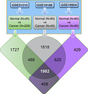 Figure 1: Human lung tissue data sets used in this study. Three independent gene transcript data sets containing LuADC and normal lung tissue samples were used. Differential expression of tumor versus normal using a fold-change cut-off of 5.0 and adjusted p-value < 0.0001 identified the 1982 common probe IDs consistently deregulated in all three datasets.