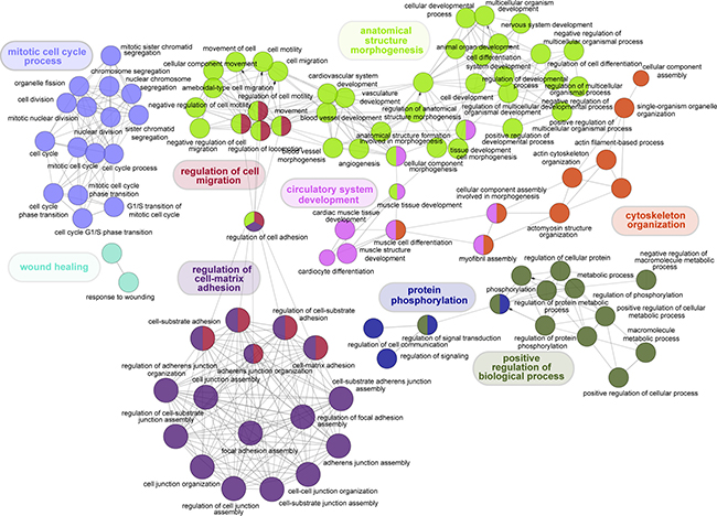 Figure 3: Visual representation of Gene Ontology enrichment analysis of genes significantly associated with OS in LuADC. Functional enrichment analysis of the 600 genes significantly associated with OS was performed using ClueGo based on Gene Ontology categories (p < 0.001). Non-redundant biological terms for our 600-gene set were visualized in a functionally grouped network and related processes were colored by function.