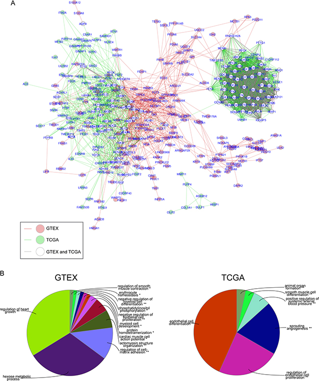 Co-expression network analysis has been used to identify clusters of genes with common biological functionality important in normal or tumor tissues. We used data obtained from the GTEx database of 320 normal human lung tissues and the TCGA database of 517 LuADC samples to reveal the expression architecture of 600 OS-associated genes in normal lung and LuADC tissues. We first calculated correlation coefficients among 600 genes in both normal and LuADC tissue samples, and then constructed a gene co-expression network where nodes represent individual genes and edges connecting genes represent a significant correlation in expression (R ≥ |0.7|; adjusted p-value < 0.001; Supporing Information Supplementary Figure 1). We then performed a comparison analysis between these two correlation networks by generating a composite network highlighting nodes and edges that were found exclusively in normal lung (red), exclusively in LuADC (green) or present in both (white) (Figure 4A). This analysis revealed a shared co-expression clique enriched for cell cycle and mitosis genes and a second, larger, clique containing a sub-clique of genes co-expressed in normal lung (red) and genes co-expressed in LuADC (green). Gene Ontology analysis of these subcliques revealed significant enrichment for muscle growth, metabolism and cell-matrix adhesion in normal lung and endothelial cell differentiation and angiogenesis in LuADC (Figure 4B).