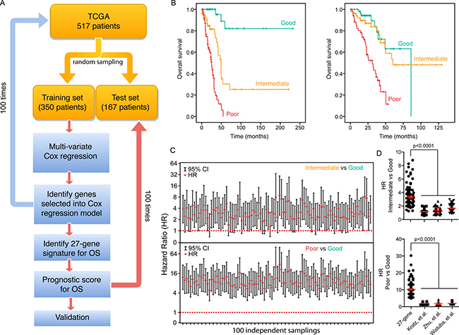 We designed a strategy to develop a prognostic scoring system (Figure 5A). We first used a resample method to split the TCGA dataset (total 517 patients) into 100 training (350 patients) and 100 testing (167 patients) datasets. We then performed a multivariate Cox regression analysis on all 100 training sets to discover statistically significant independent genes within the 600-gene set for predicting OS. The genes that recurred in at least 30% of 100 training sets were included in our final 27-gene signature (Supporing Information Supplementary Table 3). A prognostic score for a patient was used to assess a patient’s risk of death and was defined as the linear combination of logarithmically transformed gene expression levels weighted by average Cox regression co-efficient obtained from 100 training data sets (Supporing Information Supplementary Table 4). The prognostic scores were assigned for all patients in both training and testing sets. In each training set, the patients were then divided into tertiles based on their prognostic score (good, intermediate and poor) and the prognostic score at the cut-points was recorded. Kaplan-Meier analysis was performed and a log-rank test was used to determine significant differences in OS among different groups for all training sets (Figure 5B). The hazard ratio (HR) was calculated for each testing set for the “intermediate” and “poor” groups in comparison to the “good” group (Figure 5C). In all test sets, patients in the “poor” group had a significant shorter OS than those in “good” group (HR confidence interval above “1”) (Figure 5C, bottom panel), where in more than 70% of the test sets, patients in the “intermediate” group had a significant shorter OS than those in “good” group (Figure 5C, top panel), indicating that this prognostic scoring system has discriminative ability to distinguish patients with good prognosis from patients with worse prognosis.