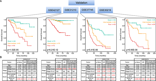 To further validate our biomarker panel, mRNA expression levels for the 27-gene signature were obtained from four additional datasets (GSE42127, GSE31210, GSE37745 and GSE30219). New coefficients for 27 genes were obtained from Cox regression. Prognostic scores for all patients were calculated and patients were ranked based on their scores and divided into three equal sized cohorts. Kaplan-Meier analysis and a long-rank test were used to determine differences in survival.