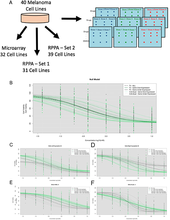Figure 1: (A) Experimental design with melanoma cell lines processed with HTS, whole genome microarray genechip, and RPPA. We performed simulations under the HTS under the null model – no influence from GEX (B) and under the alternative model for left asymptote differences (C), right asymptote differences (D), X-Mid differences (E), Scale differences (F), and a combination of the parameters.