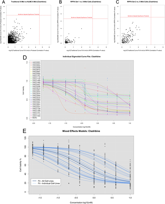 Figure 2: Differences observed between using traditionally called IC50, NLME called IC50, and LLR tests. (A) -log10p-values for associations between probe set expressions and traditionally called IC50 or NLME called IC50. (B) -log10p-values for associations between RPPA set 1 expression and traditionally called IC50 or NLME called IC50. (C) -log10p-values for associations between RPPA set 2 expression and traditionally called IC50 or NLME called IC50. (D) Dose response curves fit individually for Cladribine. (E) Dose response curves leveraging information across cell lines, which balances inter- and intra- cell line variability.