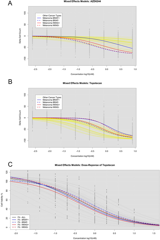To assess concordance between our UACC melanoma cell lines and the CCLE melanoma cell lines, we compared NLME curve fits by subdividing the cell lines by BRAF and NRAS mutation status in both data sets. We found cases where mutation status had an opposite impact on curve fits between the two data sets – though this is likely due to differences in cell lines used. For example, for the drug Topotecan, we found that NRAS mutations led to greater sensitivity and BRAF mutations led to greater resistance in the CCLE cell lines (Figure 4B) compared to the UACC cell lines. However, in our UACC cell lines, both NRAS and BRAF mutations led to greater sensitivity to the Topotecan (Figure 4C). This suggests that while the mutation status could help improve NLME curve fits, careful data analyses should be considered. In this particular case, we suggest incorporating the NRAS mutation status, but omitting the BRAF mutation status, in fitting NLME curves for Topotecan in melanoma cell lines.