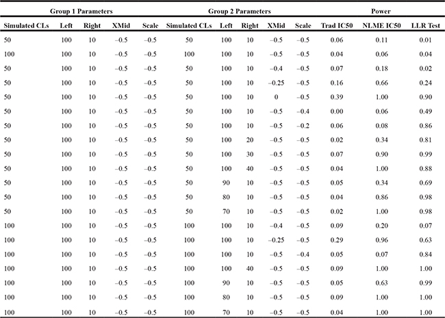 Key: Values shown present the number of cell lines (CLs), the left asymptote, right asymptote, X-Mid, and Scale for each simulation. Power results were calculated using tests based on traditionally estimated IC50 values, NLME estimated IC50, and the Omnibus LLR tests. In each simulation, one group was held constant with the following parameters. The values highlighted in red denote differences in the assumed parameter values for the two groups. Note that the first two rows are simulations under the null hypothesis (i.e., no difference in parameter settings between the two groups).