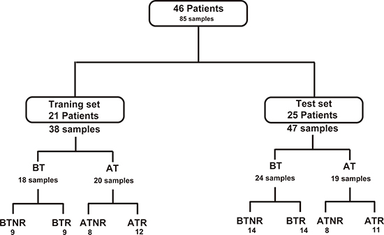 Figure 1: Flowchart of the distribution of patients and samples. BT: before RFA therapy, AT: after RFA therapy; NR: HCC patients without recurrence; R: patients with recurrence.