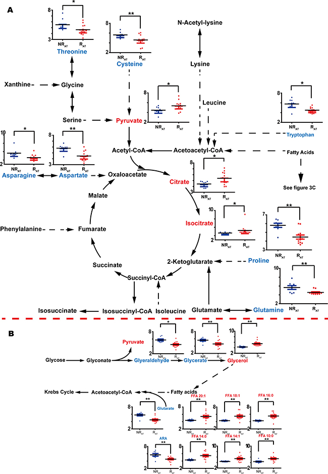 Notable upregulation of glycerol (p < 0.01), which is another precursor of triglyceride (TG) synthesis other than FFAs, was observed in RAT patients compared with NRAT patients. In addition, two upstream metabolites for glycerol, glyceraldehyde (p < 0.05) and glycerate (p < 0.01), were decreased. HCV induces insulin resistance and inhibits synthesis of TG, consistent with the accumulation of glycerol and FFAs in patients with relapse, shown in Figure 4B.