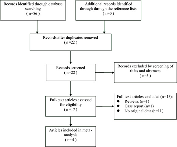 86 citations were generated from the search strategy. Through the literature search and browsing titles and/or abstracts, 17 papers were identified as potentially relevant (Figure 1). 13 of these 17 articles were subsequently excluded from our study due to several reasons, including 1 was review, 1 was case report, and 11 that did not provide HRs or CIs. A total of 4 prospective studies was included in the final meta-analysis [16, 22–24].