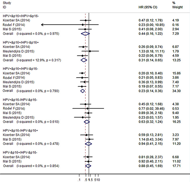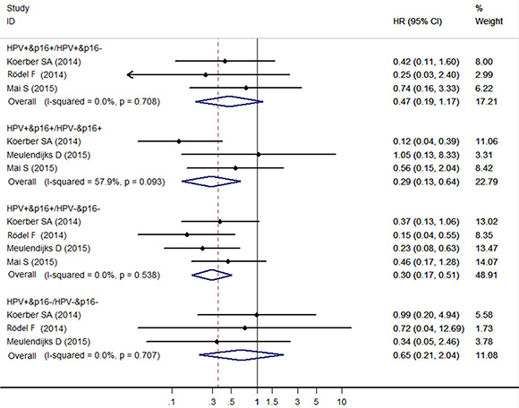 The meta-analysis showed no significant association for DFS/DSS/RFS/PFS comparing HPV+/p16+ to HPV-/p16+ cancers the HR (95% CI) being 0.44 (95% CI: 0.16–1.22) from the 3 individual effect estimates. Compared with HPV-/p16+ cancers, patients with HPV+/p16+ cancers had significant improved DFS/DSS/RFS/PFS (HR = 0.31, 95% CI: 0.14–0.65), and patients with HPV+/p16- cancers had no significant improved DFS/DSS/RFS/PFS (HR = 0.94, 95% CI: 0.41–2.15). Compared with HPV-/p16- cancers, patients with HPV+/p16+ cancers had significant improved DFS/DSS/RFS/PFS (HR = 0.23, 95% CI: 0.14–0.36), patients with HPV+/p16- cancers had no significant improved DFS/DSS/RFS/PFS (HR=0.63, 95% CI: 0.32–1.24), and patients with HPV-/p16+ cancers had no significant improved DFS/DSS/RFS/PFS (HR = 0.88, 95% CI: 0.45–1.69) (Figure 3).
