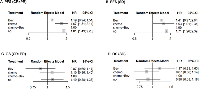 Figure 3: Pooled HRs of PFS for patients with CR/PR after induction therapy (A) and those with SD (B) and pooled HRs of OS for patients with CR/PR after induction therapy (C) and those with SD (D) determined using direct meta-analysis. Abbreviations: Bev, Bevacizumab; HR, hazard ratio; PFS, progression-free survival; OS, overall survival; CR, complete response; PR, partial response; SD, stable disease.