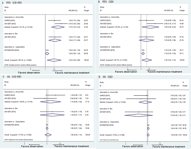 This meta-analysis suggested that the patients who achieved CR/PR after the induction treatment benefited more from maintenance treatment than those who showed SD (PFS: HR for CR/PR 1.50 vs. HR for SD 1.35; OS: HR for CR/PR 1.04 vs. HR for SD 1.03). The results of network meta-analysis suggested that chemotherapy alone and observation were inferior to chemotherapy plus Bev as maintenance treatment.