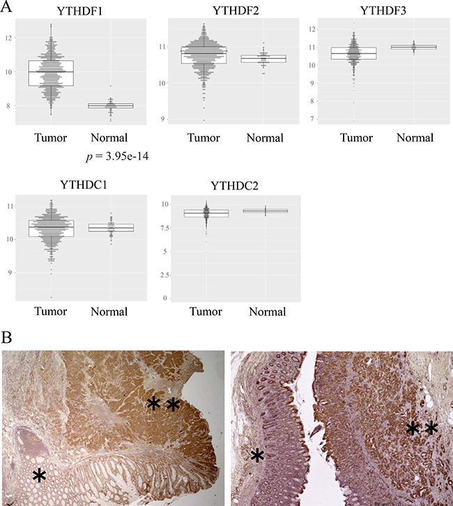 Figure 1: Predominant expression of YTHDF1 in CRC tissues. (A) Expressions of the YTH domain family in colorectal tumor or normal tissue. We analyzed expressions of the YTH domain family using the TCGA colorectal adenocarcinoma (COADREAD) database, which consisted of 671 tumor parts and 51 normal tissues. (B) Representative immunohistochemical staining of YTHDF1 in CRC. “*” shows a normal part and “**” shows a tumor of colorectal tissue.