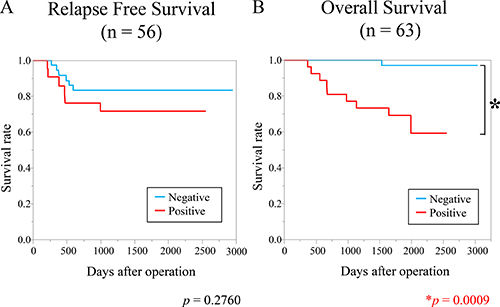 Statistically significant differences were determined by Student’s t-test and Fisher’s exact probability test, as appropriate. JMP® Pro12 (SAS Institute Inc., Cary, NC, USA) was used for all statistical analyses. In the Kaplan–Meier method, we included all patients (n = 63) in the overall survival analysis. Seven patients with an unresectable distant metastasis were excluded from the relapse-free survival analysis. The log-rank test was used to check differences between the survival curves. Variables shown by univariate analysis to be significantly correlated with survival were entered into a Cox proportional hazards regression model for multivariate analysis. Data are reported as means ± SEM. Results were considered statistically significant when p < 0.05 was obtained.