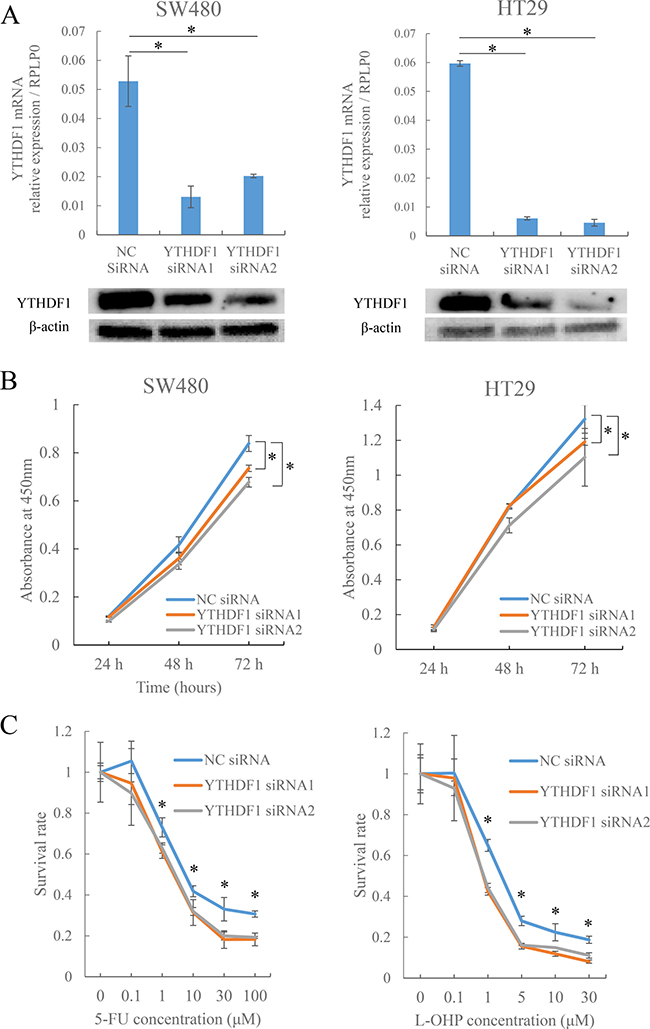 Figure 3: Knockdown of YTHDF1 affects cell proliferation and chemosensitivity in CRC cells. (A) mRNA and protein expression levels of YTHDF1 compared to negative control siRNA (NC siRNA) or two types of YTHDF1 siRNA (YTHDF1 siRNA1 and siRNA2) transfected SW480 and HT29 cells. YTHDF1 expression was normalized to RPLP0 in qRT-PCR and normalized to β-actin in Western blotting. *p < 0.05. (B) Proliferation assay after transfecting SW480 and HT29 cells with NC siRNA or YTHDF1 siRNA1 or siRNA2. Each bar represents the mean ± SEM of samples measured in triplicate. *p < 0.05. (C) Chemosensitivity assay using 5-FU or L-OHP after transfecting HT29 cells with NC siRNA or YTHDF1 siRNA1 or siRNA2. Each bar represents the mean ± SEM of samples measured in triplicate. *p < 0.05.