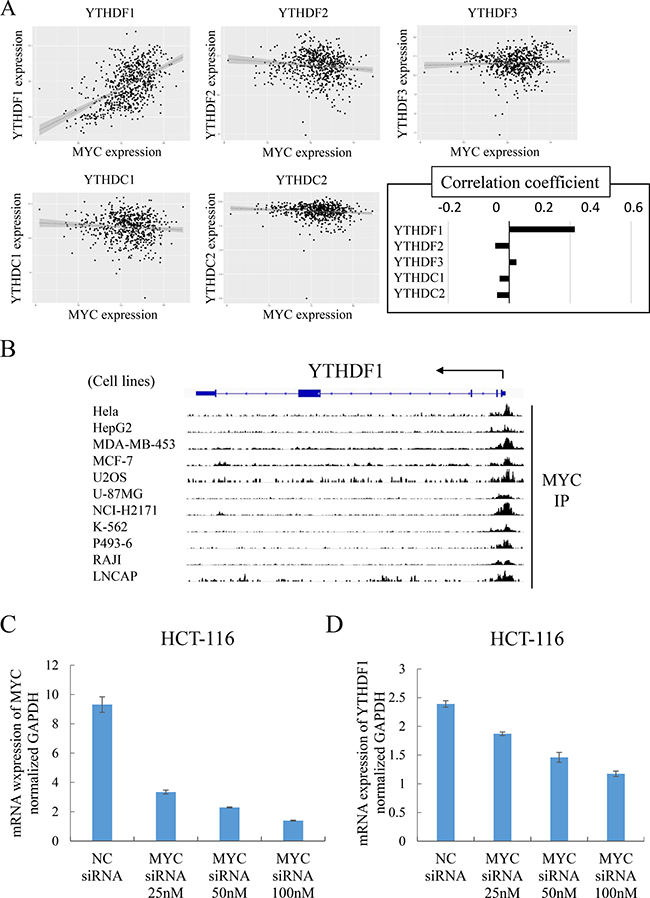 Figure 4: YTHDF1 was transcriptionally regulated by c-MYC. (A) Correlations between the YTH domain family and c-MYC. We used the TCGA colorectal adenocarcinoma (COADREAD) database, which consisted of 677 tumor parts. (B) ChIP-atlas (http://chip-atlas.org/) data show that c-MYC binds to the transcription initiation region of YTHDF1. (C) mRNA expression level of c-MYC compared to negative control siRNA (NC siRNA) or c-MYC siRNA (25, 50, and 100 nM) transfected cells. YTHDF1 expression was normalized to GAPDH in qRT-PCR. *p < 0.05. (D) mRNA expression level of YTHDF1 compared to negative control siRNA (NC siRNA) or c-MYC siRNA (25, 50, and 100 nM) transfected cells. YTHDF1 expression was normalized to GAPDH in qRT-PCR. *p < 0.05.