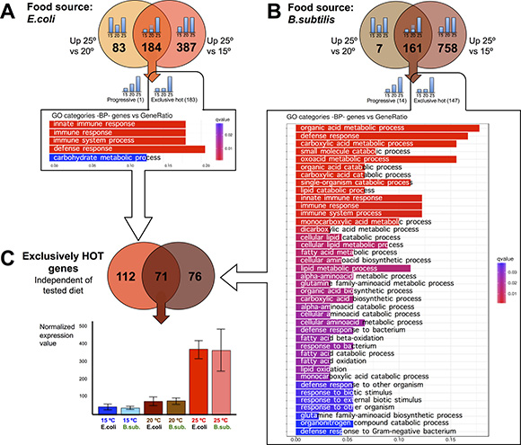 Figure 3: C. elegans gene up-regulation at physiologically hot temperature. (A) Pair comparisons of gene expression in nematodes fed E.coli at different temperatures shows that 184 genes exhibit significantly higher expression at 25ºC than at 20ºC and 15ºC. Out of them, 183 genes named “exclusively hot”, kept the same expression level at cold (15ºC) or standard growth temperatures (20ºC) but up-regulate their expression at physiologically hot temperatures (25ºC). This exclusively hot response in worms fed on E. coli showed an up-regulation of genes related mainly to defense response pathways. Gene Ontology (GO) Biological Processes (BP) vs number of genes within each category appears represented in color bars, one bar per GO term. The length of the bars indicates the number of genes belonging to the different GO categories and the color indicates the statistical significance, from those with high significant expression difference (red) to those with lower expression difference (blue). (B) Pair comparisons of gene expression in nematodes fed B. subtilis at different temperatures shows that 161 genes exhibit significantly higher expression at 25ºC than at 20ºC and 15ºC. Out of them, 147 genes named “exclusively hot”, kept the same expression level at cold (15ºC) or standard growth temperatures (20ºC) but up-regulate their expression at physiologically hot temperatures (25ºC). This exclusively hot response in worms fed on B. subtilis showed an up-regulation of genes enriched for several functions such as defense response and metabolism of organic acids, lipids and amino acids. Gene Ontology (GO) Biological Processes (BP) vs number of genes within each category appears represented in color bars, one bar per GO term. The length of the bars indicates the number of genes belonging to the different GO categories and the color indicates the statistical significance, from those with high significant expression difference (red) to those with lower expression difference (blue). (C) 71 genes show an exclusively hot response independently of the tested diet. However, its Gene Ontology analysis did not show an obvious enrichment for any biological functions beyond the fact of having been up-regulated at 25ºC. For the rest of the genes, the exclusive hot response was specific for the E. coli diet (112 genes) or specific for the B. subtilis diet (76 genes). Expression profile for this set of 71 genes is exemplified in the histogram. There are no significant differences at 15ºC or 20ºC but a significant upregulation at 25ºC, in both diets.