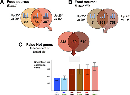Figure 4: C. elegans gene down-regulation at physiologically cold temperature. (A) E. coli fed worms showed 387 genes with significantly higher expression when worms were maintained at 25ºC relative to worms maintained at 15ºC, but did not show differences relative to worms maintained at 20ºC. These 387 genes were referred to as “false hot” genes in an E. coli diet. (B) B. subtilis fed worms showed 758 genes with significantly higher expression when worms were maintained at 25ºC relative to worms maintained at 15ºC, but did not show differences relative to worms maintained at 20ºC. These genes were referred to as “false hot” genes in a B. subtilis diet. (C) 139 genes behaved as “false hot” genes independently of the tested diet. Expression pattern for this set of genes is exemplified in the histogram. There are no significant differences at 20ºC or 25ºC but a significant downregulation at 15ºC, in both diets.