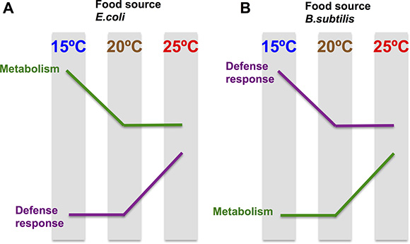 Figure 8: The transcriptomic temperature response is opposite in nematodes grown on an E. coli diet vs a B. subtilis diet. (A) E. coli fed worms enhance defense response gene expression and decrease expression of genes associated with metabolic functions when the maintenance temperature increases. Genes involved in metabolism are significantly up-regulated in E. coli fed worms compared to B. subtilis fed worms, independently of the tested temperature. (B). B. subtilis fed worms decrease defense response gene expression and enhance expression of genes associated with metabolic functions when the maintenance temperature increases. Genes involved in defense response are significantly up-regulated in B. subtilis fed worms compared to E. coli fed worms, independently of the tested temperature.