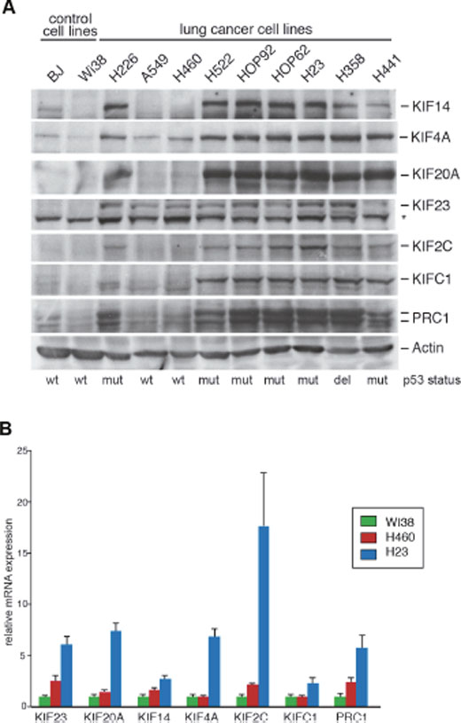We first analyzed the expression levels of selected mitotic kinesins (KIF4A, KIF14, KIF20A, KIF23, KIF2C, KIFC1) and of the microtubule-binding protein PRC1. KIF4A, KIF14, KIF20A, KIF23 and PRC1 are involved in central spindle formation and cytokinesis [16, 17]. KIF2C and KIFC1 function in other stages of mitosis but have also been implicated in central spindle function [19, 20]. These two proteins were included in our study because they have been suggested as potential therapeutic targets [21, 22]. Expression of the kinesins and of PRC1 was analyzed in a panel of human lung cancer cell lines by immunoblotting. Non-transformed BJ and WI-38 fibroblasts were used as a control. Kinesin and PRC1 expression was detected in all cancer cell lines. In contrast, kinesin expression in non-transformed control cells was low (Figure 1A). Highest kinesin expression levels were detected in p53-mutant cell lines compared to cell lines with wildtype p53. KIF23 was already elevated in lung cancer cell lines with wildtype p53-status, suggesting that other pathways contribute to its overexpression in lung cancer cells. mRNA expression of kinesins reflected protein levels with higher levels in p53-mutant H23 cells compared to H460 cells with wildtype p53 status (Figure 1B).