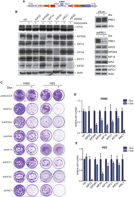 Figure 2: Mitotic kinesins and PRC1 are required for proliferation of NSCLC cells. (A) Scheme of the pINDUCER vector (B) Inducible shRNAs directed at mitotic kinesins or PRC1 were stably introduced into H23 NSCLC cells. Knockdown after induction of the shRNA with doxycycline was determined by immunoblotting. The asterisk indicates a background band. (C) H23 and H460 were cells stably transduced with the indicated inducible shRNA constructs and were plated at low density. Colony formation in absence and presence of doxycycline (to induce the shRNA) was determined by crystal violet staining after 7 days. (D and E) Quantification of the colony formation assays shown in C.