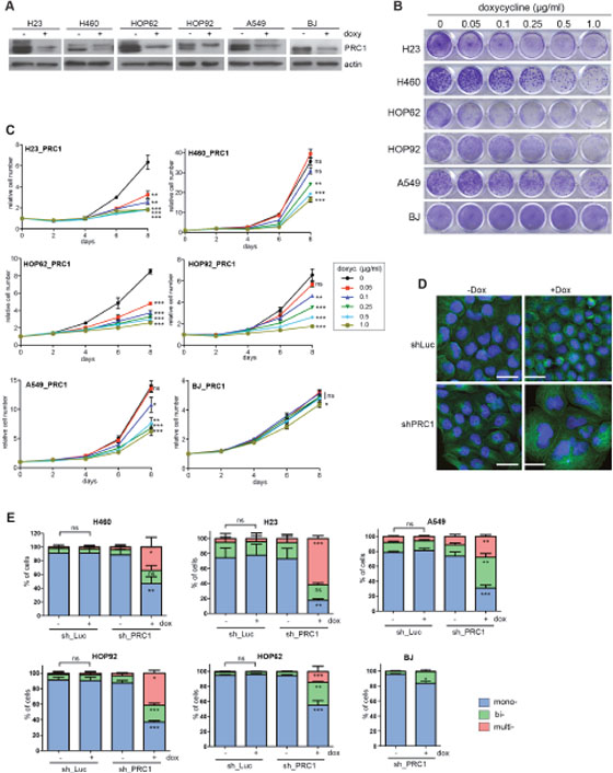 Figure 3: PRC1 is required for proliferation of lung cancer cell lines. (A) The indicated cell lines were stably infected with a PRC1-specific shRNA. Cell lines were treated with 1 μg/ml doxycycline for 4 days to induce the shRNA. PRC1 levels were determined by immunoblotting. (B) Cell lines expressing the PRC1-specific shRNA were cultured for a period of 8 days with the indicated concentrations of doxycycline. Colonies were stained with crystal violet. (C) Quantification of growth of lung cancer cell lines and BJ cells stably expressing the PRC1-specific shRNAs in the presence of the indicated concentrations of doxycycline was analyzed over 8 days. n=3 replicates. Statistical significance (Student’s t-test) for clarity only shown for day 8. *p<0.05; **p<0.001; ***p<0.0001; ns: not significant. (D) H460 cells either expressing an inducible control shRNAs (shLuc) or a shRNA direct at PRC1 (shPRC1) were treated with or without doxycycline for 4 days. Subsequently cells were fixed and immunostained with tubulin (green) and Hoechst (blue) and investigated by fluorescence microscopy. Bar: 25 μm. (E) Quantification of mono-, bi- and multinucleated cells in cell lines expressing either a control shRNA (sh_Luc) or a PRC1-specific shRNA (sh_PRC1) and treated without or with 1 μg/ml doxycycline for 4 days to induce the PRC1 shRNA. n=3 replicates. Statistical significance determined by Students’s t-test. *p<0.05; **p<0.001; ***p<0.0001; ns: not significant.