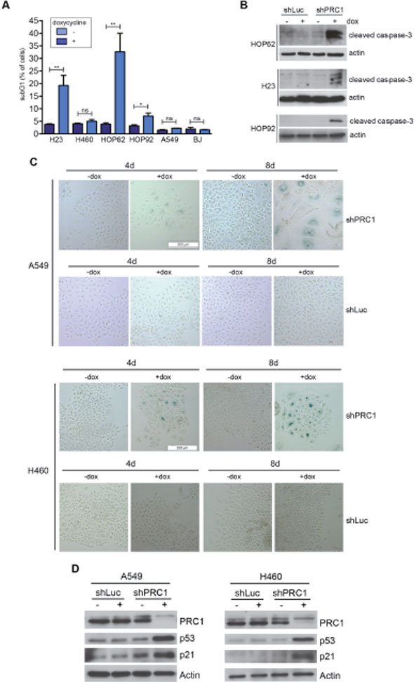 We therefore next investigated the effect of depletion of PRC1 in five different human lung cancer cell lines and in immortalized BJ fibroblast cells, which served as an untransformed control cell line. Depletion of PRC1 was first validated by immunoblotting (Figure 3A). We also established control cell lines expressing a shRNA directed at luciferase (shLuc), to exclude possible non-specific effects of doxycycline. Next, conditional knockdown cell lines were plated at low density and treated with different concentrations of doxycycline to induce the expression of the shRNA. Cell number at different time points was determined by crystal violet staining (Figure 3B). Quantification showed that PRC1 inhibits the proliferation of all five lung cancer cell lines in a dose-dependent manner (Figure 3C). Importantly, doxycycline did not inhibit proliferation of lung cancer cell lines stably infected with the control shRNA (Supplementary Figure 2A, B). Significantly, non-tumorigenic BJ cells were less sensitive to the inhibition of PRC1 compared to the tumor cell lines. Examination by microscopy and quantification showed that silencing of PRC1 strongly increased the number of bi- and multinucleated cells in all five lung cancer cell lines, consistent with its known function in mitosis and cytokinesis (Figure 3D, 3E). Doxycycline had no effect on nucleation in cells expressing a luciferase control shRNA (Figure 3D, 3E). Although depletion of PRC1 in BJ cells also resulted in an increased fraction of binucleated cells, this effect was less pronounced compared to the tumor cell lines. Cell cycle analysis by FACS revealed a strong increase in the sub G1 population, indicative of degraded DNA, a hallmark of apoptosis, in H23 and HOP62 cells upon depletion of PRC1 (Figure 4A; Supplementary Figure 3). The sub G1 population was also increased in HOP92 cells. Immunoblot analysis of cleaved caspase 3, the effector caspase downstream of intrinsic and extrinsic apoptosis stimuli, confirmed induction of apoptosis in HOP62, HOP92 and H23 cells upon depletion of PRC1 (Figure 4B). Furthermore, Annexin V staining independently confirmed apoptosis upon depletion of PRC1 in HP62, HOP92 and H23 cells, but not in BJ cells. (Supplementary Figure 4). In conclusion, the depletion of PRC1 resulted in apoptosis in the three p53-mutant lung cancer cell lines H23, HOP62 and HOP92. Interestingly, no apoptosis was observed in BJ cells and in A549 and H460 cells with wildtype p53-status. Instead, after depletion of PRC1, A549 and H460 cells became senescent, as evidenced by staining for ß-galactosidase, a marker of senescent cells (Figure 4C). Importantly, p53 is indeed induced by the depletion of PRC1 in p53-proficient A549 and H460 cells as shown by immunoblot analysis (Figure 4D). Furthermore, p21, a cyclin dependent kinase inhibitor and a bona-fide downstream target of p53 was also induced, indicating that p53 activity is stimulated after depletion of PRC1.