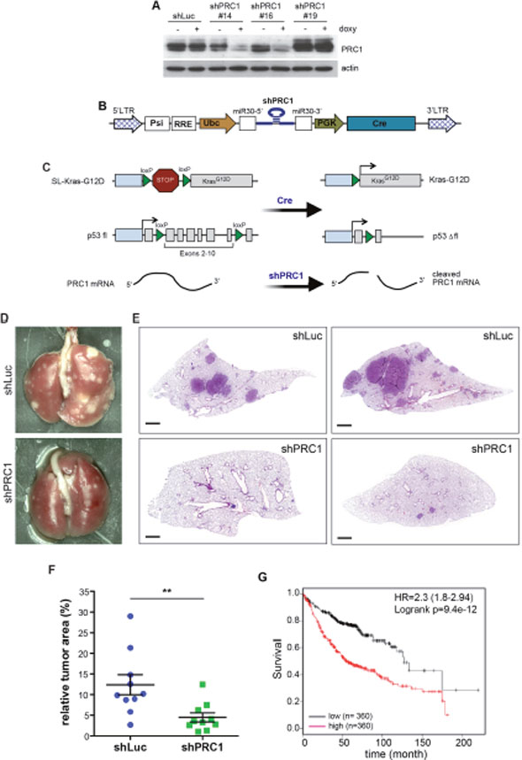 Figure 6: PRC1 is required for lung tumorigenesis in vivo. (A) Lentiviral constructs encoding shRNAs directed at murine PRC1 were introduced into NIH-3T3 cells. The depletion of PRC1 after addition of 1 μg/ml doxycycline for 4 days was analyzed by immunoblotting. shLuc: control shRNA directed at luciferase. (B) Scheme of the lentiviral Cre/ shRNA vector to deliver a mir30 based shRNA and Cre recombinase in vivo. (C) Strategy to activate K-Ras and delete p53 by Cre and deplete PRC1 by RNAi in a lung-specific manner by intratracheal infection of LSL-KRasG12D, p53fl/fl mice with the lentivirus. (D and E) LSL-KRasG12D;p53fl/fl mice were infected with a bifunctional lentivirus encoding Cre and a control shRNA (n=10) or with a virus encoding Cre and a shRNA specific for PRC1 (n=10). Representative lungs (D) and H&E stained lung sections are shown (E). Bar: 1mm. (F) Quantification of tumor area to total lung area. Each symbol represents the analysis of an individual animal. The tumor area was obtained by measuring all tumors from two sections from each mouse. Mean and SEM. **p < 0.005 (Student’s t-test.) (G) Expression of PRC1 linked to clinical outcome of lung cancer patients. Kaplan-Meier plot showing overall survival of lung adenocarcinoma patients based on expression of PRC1.