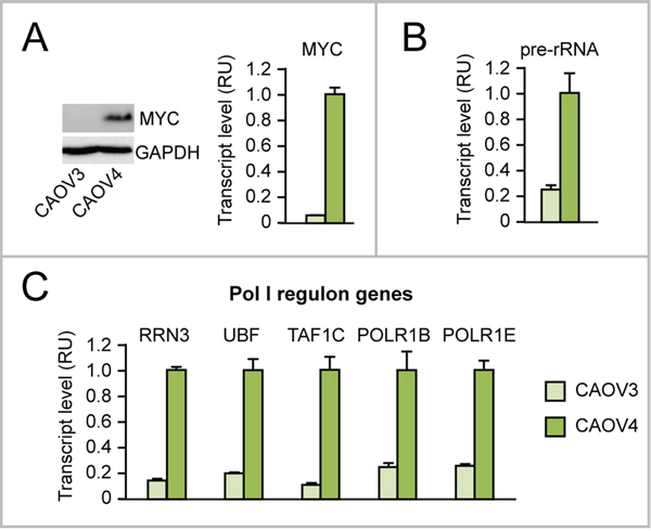 According to The Cancer Genome Atlas, MYC amplification/upregulation is frequent in cancer, including ovarian cancer, where it is detected in over 30% of cases [30]. For this reason, we tested if MYC overexpression in ovarian cancer induces Pol I-mediated rRNA transcription as well as Pol II-mediated transcription of “Pol I regulon” genes. As shown here, CAOV4 ovarian cancer cells, which overexpress MYC (Figure 2A), display increased levels of rRNA transcription (assessed as pre-rRNA) (Figure 2B) and upregulation of “Pol I regulon” genes (Figure 2C) relative to CAOV3 ovarian cancer cells, which do not overexpress MYC.