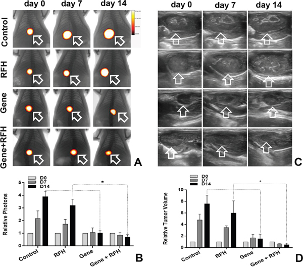 Figure 4: (A and B) Optical/x-ray imaging to assess the tumor growth and response to the treatments at days 7 and 14 after the treatments shows the lowest bioluminescence signals (orange-yellow color, arrows inA) in the combination therapy group, compared to the other control groups (*p<0. 05). (C and D) Ultrasound imaging shows the decreased tumor size (arrows) of the group with combination therapy, compared to the other three treatments (*p<0.05).