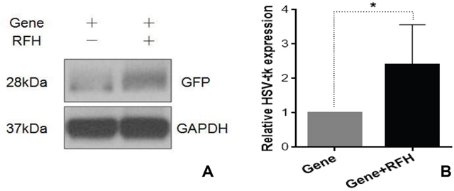 Figure 6: Western blotting analysis shows the higher GFP gene expression in the tumors with RFH enhancement than the tumors with HSV-TK/GFP gene transduction alone (*p<0. 05).
