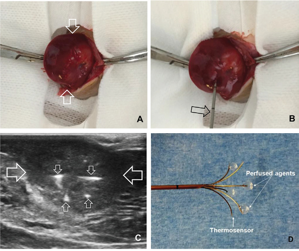 Figure 7: (A) An orthotopic hepatic tumor (arrows) is created in the rat liver. (B-D) Under real-time ultrasound imaging guidance, the electrode is precisely placed into the tumor (between large arrows) and then multiple infusion needles (small arrows) of the electrode is opened to deliver HSV-TK/lentivirus, followed by intratumoral RF heating using the same electrode.
