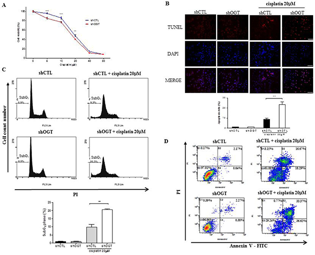 To determine the effect of OGT on sensitivity to cisplatin, we carried out a MTT assay, TUNEL stain, and fluorescence-activated cell sorting (FACS) analysis to measure cell metabolism and viability in HeLa cells transfected with shCTL or shOGT after cisplatin treatment. shOGT HeLa cells showed enhanced cisplatin sensitivity compared to shCTL HeLa cells (Figure 6A, ***p < 0.001). To examine the effects of OGT knockdown on cisplatin-induced apoptosis, shCTL and shOGT HeLa cells were treated with 20 μM cisplatin for 24 h and apoptosis was analysed using TUNEL staining and FACS analysis (Figure 6B, **p < 0.01 and Figure 6C, **p < 0.01). We found that depletion of OGT with an OGT-specific shRNA resulted in more than a two-fold increase in cisplatin-induced HeLa cell death. In particular, the combination treatment of an OGT-specific shRNA with cisplatin resulted in late apoptosis, as shown by FACS (Figure 6D).