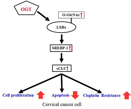 In this study, the relationship between O-GlcNA cylation and drug resistance in cervical cancer cells was examined. The results demonstrate that upregulation of LXR O-GlcNAcylation enhances sCLU expression through increased expression of SREBP-1, which induces drug resistance in cervical cancer cells.