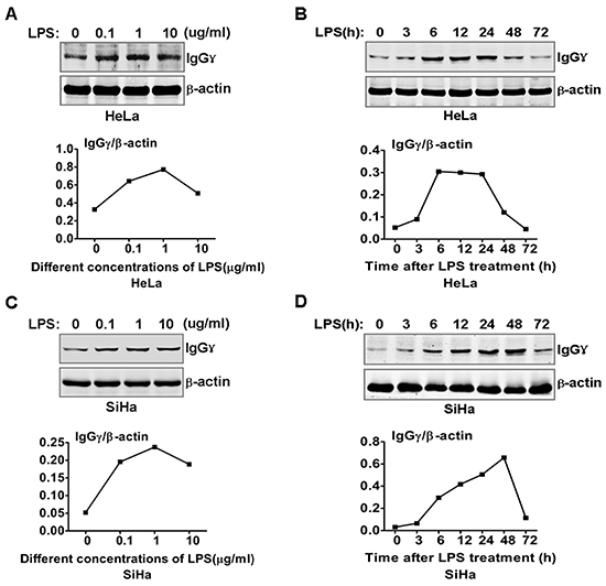 Figure 1: LPS regulated IgG expression in cervical cancer cells. HeLa cells (A) and SiHa cells (C) were stimulated with the indicated doses of LPS for 24 h. IgGγ expression was detected with immunoblot. HeLa cells (B) and SiHa cells (D) were stimulated with 100 ng/ml LPS as indicated. IgG expression was detected with immunoblot. The shown results are representative of three independent experiments. The quantified results of IgGγ expression were shown in the lower panel. The values were normalized to the β-actin signal.