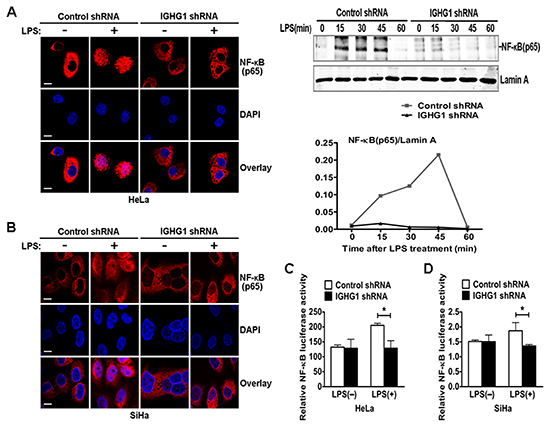 Figure 4: Reduction of IgG impaired LPS-Induced NF-κB activation and nuclear translocation in cervical cancer cells. (A) HeLa cells stably expressing IGHG1 shRNA or control shRNA were treated with or without 100 ng/ml LPS for 45 minutes. The above cells were fixed and stained for NF-κB (red). Nuclei were stained with 4', 6-diamidino-2-phenylindole (DAPI). The merged images were viewed with a confocal microscope and shown in the left panel (Scale bar, 20 μm). The above cells were treated with 100 ng/ml LPS, cell nuclear proteins were then prepared at different time points (0, 15, 30, 45, and 60 minutes) and blotted with NF-κB subunit p65 antibody. Lamin A contained in nuclear fractions was probed as quantitative controls. The results shown are representative of three independent experiments (right panel). The quantified results of the above proteins were shown in the right panel. (C) HeLa cells stably expressing IGHG1 shRNA or control shRNA were transiently cotransfected with pTK-Renilla-luciferase and NF-κB luciferase reporter plasmids. After 24 h of culture, the cells were treated with or without 100 ng/ml LPS for 20 h. NF-κB luciferase activity was measured using the Dual-Luciferase Reporter Assay System normalized by Renilla luciferase activity. Similar experiments were performed using SiHa cells (B, D). Data are shown as mean±S.D. of three independent experiments (* P<0.05).