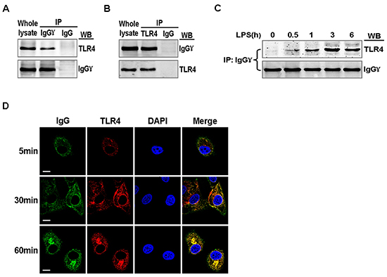 Figure 5: Association of TLR4 with IgG in LPS activated cervical cancer cells. HeLa cells were stimulated with 100 ng/ml LPS for 1 h (A and B) or 0, 0.5, 1, 3, and 6 h. (C). Lysates of the cells were immunoprecipitated with mouse anti-human IgGγ or TLR4 or normal mouse IgG and then detected with anti-TLR4 or anti-IgGγ antibodies. The results shown are representative of three independent experiments. (D) HeLa cells were stimulated with 100 ng/ml LPS for 5, 30, and 60 min, then fixed and double-stained for IgGγ (green) and TLR4 (red). Nuclei were stained with DAPI. The merged images (yellow) were viewed with a confocal microscope and shown (Scale bar, 20 μm)