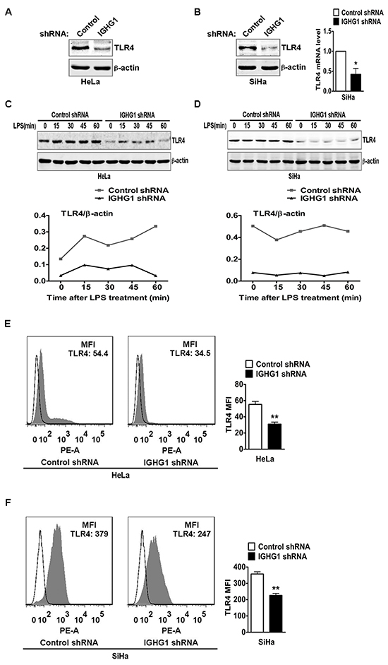 Figure 6: Reduction of IgG downregulated TLR4 expression. TLR4 expression at protein level in HeLa cells stably expressing IGHG1 shRNA or control shRNA. (A) and IGHG1 silenced SiHa cells or control cells. (B) were measured with immunoblot using anti-TLR4 Antibody. μ-actin was used as a quantitative control. TLR4 expression at mRNA level in the above SiHa cells was also measured with RT-qPCR (B). (C) HeLa cells stably expressing IGHG1 shRNA or control shRNA and IGHG1 silenced SiHa cells or control cells. (D) were treated with 100 ng/ml LPS. Dynamic changes of TLR4 expression (0, 15, 30, 45, and 60 minutes) were examined with immunoblot using TLR4 antibody. μ-actin was used as quantitative control. The results shown are representative of three independent experiments (upper panel). The quantified results of TLR4 expression were shown in the lower panel. The values were normalized to the μ-actin signal. TLR4 expressions on plasma membrane in HeLa cells stably expressing IGHG1 shRNA or control shRNA. (E) and IGHG1-silenced or control vector-silenced SiHa cells. (F) were detected with phycoerythrin-conjugated TLR4 antibody by flow cytometry. The mean fluorescence intensity (MFI) was calculated and shown at the right panel. The data are expressed as mean±S.D. from three independent experiments (*P<0.05; **P<0.01)