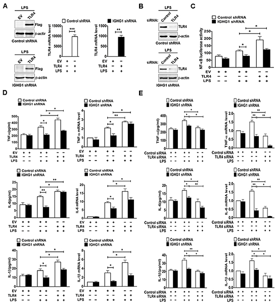 Figure 8: Reduction of IgG reduced LPS-induced proinflammatory cytokine production in vivo. (A) The protein and mRNA of IgGγ in tumor tissues from the above different groups of mice, including group 1 (injection of control shRNA cells), group 2 (injection of control shRNA cells with LPS treatment), group 3 (injection of IGHG1 shRNA cells) and group 4 (injection of IGHG1 shRNA cells with LPS treatment), were measured with immunoblot or RT-qPCR. (B-E) The mRNA of proinflammatory cytokines (TNF-α, IL-6, and IL-1β) and TLR4 in tumor tissues from the above different groups of mice were measured with RT-qPCR. (F) H&E, TNF-α, IL-6, IL-1β, and TLR4 staining (scale bar, 20 μm) of tumor tissues from the above different groups of mice. The mean densities of above protein molecules were analyzed and shown in the right panel. The RT-qPCR and mean density data are expressed as mean±S.D. from three independent experiments (*P<0.05; **P<0.01; ***P<0.001).