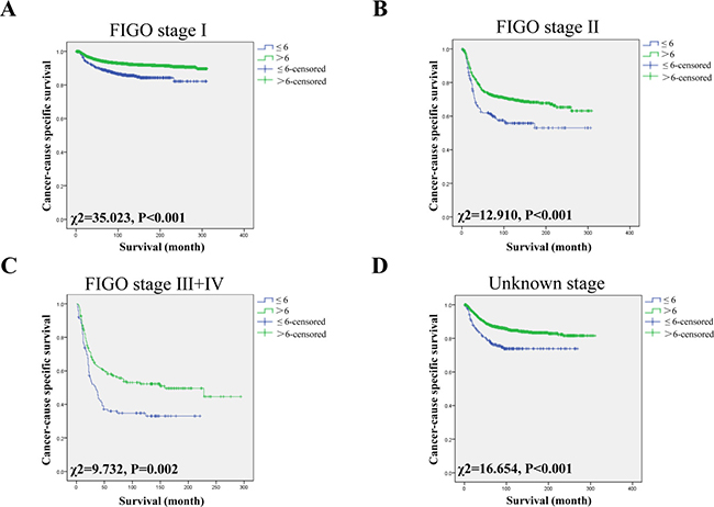 Figure 2: Log-rank tests of CSS comparing patients with NLNs (≤6 VS >6) for (A) FIGO stage I: χ2 = 35.023, P < 0.001; (B) FIGO stage II: χ2 = 12.910, P < 0.001; and (C) FIGO stage III + IV: χ2 = 9.732, P = 0.002 and (D) Unknown stage: χ2 = 16.654, P < 0.001.