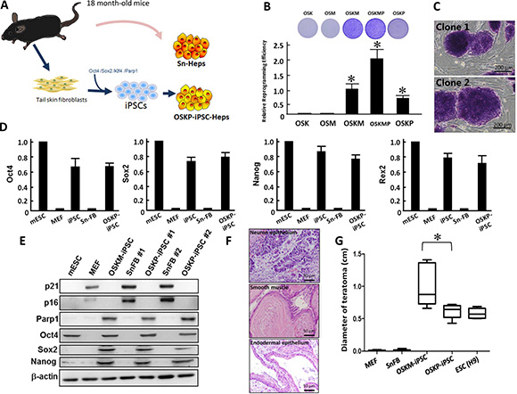 Figure 1: Reprogramming senescent somatic cells into iPSCs using Oct4/Sox2/Klf4 and Parp1. (A) Scheme illustrating the isolation of primary hepatocytes and the generation of Oct4/Sox2/Klf4/Parp1-reprogrammed hepatocytes from 18-month-old aging mice. (B) Relative reprogramming efficiency among iPSCs generated by different reprogramming factors including Oct4/Sox2/Klf4/Parp1, Oct4/Sox2/Klf4/c-Myc, Oct4/Sox2/Klf4, Oct4/Sox2/c-Myc, and Oct4/Sox2/Klf4/c-Myc/Parp1. (C) Representative staining for alkaline phosphatase in Oct4/Sox2/Klf4/Parp1-reprogrammed iPSCs (clones 1 and 2). (D) Relative mRNA expression of Oct4, Sox2 and Nanog among mouse embryonic stem cells (mESCs), MEF, Oct4/Sox2/Klf4/c-Myc-reprogrammed iPSCs, senescent fibroblasts, and Oct4/Sox2/Klf4/Parp1-reprogrammed iPSCs. (E) Western blotting showing the expression of senescent markers p16 and p21 and stemness markers Oct4, Sox2, and Nanog in two Oct4/Sox2/Klf4/Parp1-reprogrammed iPSC clones. (F) Teratoma formation by Oct4/Sox2/Klf4/Parp1-reprogrammed iPSCs. (G) Comparison of teratoma size between the recipients of Oct4/Sox2/Klf4/Parp1 and Oct4/Sox2/Klf4/c-Myc. In Panel B, *P < 0.05 vs. OSK or OSM; in panel G, *P < 0.05 vs. OSKM.