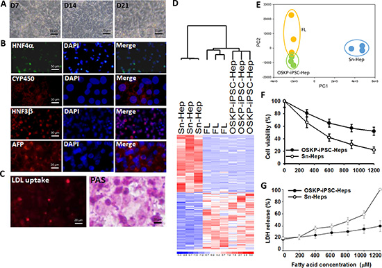 Figure 2: Differentiation of Oct4/Sox2/Klf4/Parp1-reprogrammed iPSCs into hepatocyte-like cells (OSKP-iPSC-Heps) (A) Morphology changes of OSKP-iPSC-Heps during the differentiation course. (B) Immunofluorescence showing the expression of several hepatic-specific markers, including HNF-3β, alphafetoprotein (AFP), and albumin in OSKP-iPSC-Heps. (C) Abilities for LDL uptake and glycogen synthesis in OSKP-iPSC-Heps. (D) Microarray analysis revealing the profile of differentially expressed genes among OSKP-iPSC-Heps, senescent primary hepatocytes (Sn-Heps) and fetal liver. (E) Multi-dimensional scaling analysis showing the gene expression pattern among OSKP-iPSC-Heps, Sn-Heps and fetal liver. Effect of long-term exogenous fatty acid exposure on (F) cell viability and (G) LDH release in Sn-Heps and OSKP-iPSC-Heps.